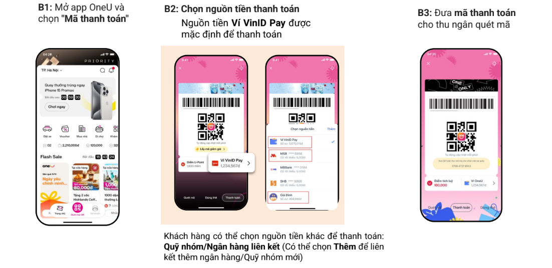 - Nếu số dư Ví VinID Pay/Quỹ nhóm/ngân hàng liên kết không đủ, ứng dụng OneU sẽ thông báo số dư không đủ => Khách hàng có thể Nạp tiền hoặc Chọn lại nguồn tiền khác để tiếp tục thanh toán.